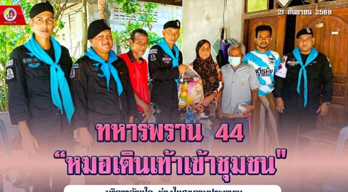 หน่วยเฉพาะกิจกรมทหารพรานที่ 44 จัดกำลังพล ชุดปฏิบัติการกิจการพลเรือน กองร้อยทหารพรานที่ 4402 จัดโครงการ “หมอเดินเท้า” ลงพื้นที่ดูแลประชาชนถึงหน้าบ้าน เพื่อเสริมสร้างสุขภาวะและสร้างความอบอุ่นในชุมชน โดยร่วมกับผู้ช่วยผู้ใหญ่บ้าน และอาสาสมัครสาธารณสุขประจำหมู่บ้านตำบลน้ำดำ อำเภอทุ่งยางแดง จังหวัดปัตตานี ลงพื้นที่เยี่ยมเยียนประชาชน โดยเฉพาะผู้สูงอายุที่อาจขาดโอกาสในการเข้าถึงบริการทางการแพทย์