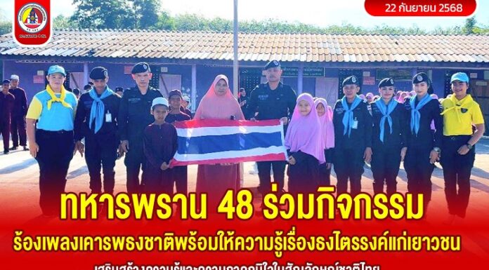 ทหารพราน 48 ร่วมกิจกรรมร้องเพลงเคารพธงชาติ พร้อมให้ความรู้เรื่องธงไตรรงค์แก่เยาวชน เสริมสร้างความรู้และความภาคภูมิใจในสัญลักษณ์ชาติไทย