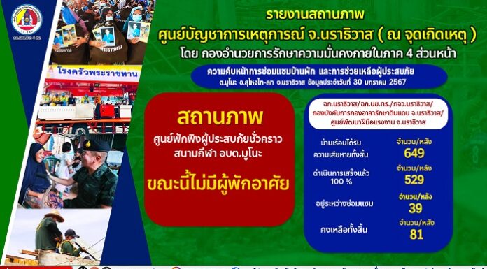 จากอุทกภัยในพื้นที่จังหวัดชายแดนภาคใต้เมื่อสิ้นปี 2566 ระยะเวลากว่า 1 เดือนที่ผ่านมา ทางเจ้าหน้าที่ทหารพรานในพื้นที่ยังเร่งมือช่วยเหลือฟื้นฟูพื้นที่ที่ได้รับผลกระทบจากอุทกภัย อย่างต่อเนื่อง หวังให้ประชาชนผู้ประสบภัยกลับมาใช้ชีวิตอย่างปกติสุข ล่าสุดเมื่อวันที่ 31 มกราคม 2567 เวลา 16.00 น. พันเอก สิทธิชัย บำรุงเขต ผู้บังคับหน่วยเฉพาะกิจกรมทหารพรานที่ 46 ได้จัดกำลังพลจิตอาสาพระราชทาน ร่วมกับผู้นำท้องที่, ผู้นำท้องถิ่น และประชาชนจิตอาสา ดำเนินการจัดกิจกรรมจิตอาสาพัฒนาทำความสะอาดฟื้นฟูอาคารสถานที่, บ้านเรือน, ซ่อมเครื่องใช้ไฟฟ้า ให้กับประชาชนที่ได้รับผลกระทบจากอุทกภัยในพื้นที่ อำเภอรือเสาะ จังหวัดนราธิวาส โดยดำเนินการซ่อมแซมฟื้นฟูบ้านเรือน จำนวน 4 หลัง ประกอบด้วย บ้านเลขที่ 57/2 หมู่ที่ 5 ตำบลรือเสาะ อำเภอรือเสาะ จังหวัดนราธิวาส ดำเนินการไปแล้ว 88%, บ้านเลขที่ 56 หมู่ที่ 1 ตำบลลาโละ อำเภอรือเสาะ จังหวัดนราธิวาส ดำเนินการไปแล้ว 65%, บ้านเลขที่ 19/1 หมู่ที่ 1 ตำบลบาตง...