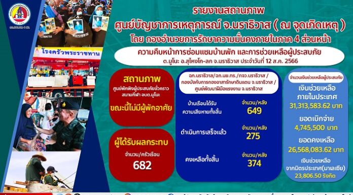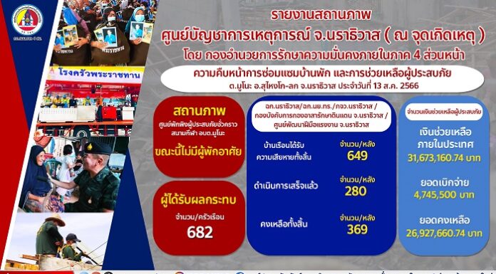 กว่า 2 สัปดาห์ที่ กอ.รมน.ภาค 4 สน. ระดมกำลังพลจิตอาสาพร้อมยุทโธปกรณ์เข้าบรรเทาความเดือดร้อนแก่ประชาชนจากเหตุโกดังพลุระเบิด ต.มูโนะ อ.สุไหงโก-ลก จ.นราธิวาส กันอย่างต่อเนื่อง ล่าสุด (12 ส.ค. 66) การซ่อมแซมและส่งมอบบ้านแล้ว 275 หลังคาเรือน ส่วนศูนย์พักพิงชั่วคราวฯ ขณะนี้ไม่มีผู้ประสบภัยเข้าพักแล้ว