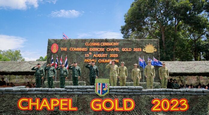 วันนี้ (13 สิงหาคม 2566) เวลา 11.00 น. ที่ สนามโรงเรียนบ้านถ้ำธง อำเภอปะทิว จังหวัดชุมพร พลโท ศานติ ศกุนตนาค แม่ทัพภาคที่ 4 พร้อมด้วย พลตรี สก๊อต วินเทอ ผู้บัญชาการกองพลที่ 1 ออสเตรเลีย ร่วมเป็นประธานในพิธีปิดการฝึกผสมระหว่างกองทัพบกไทย และกองทัพบกออสเตรเลีย ภายใต้รหัส "Chapel Gold 2023" โดยการฝึกดังกล่าวมีวัตถุประสงค์ เพื่อพัฒนาขีดความสามารถ และเพิ่มพูนทักษะในการปฏิบัติการทางทหารร่วมกัน แลกเปลี่ยนความรู้และประสบการณ์การฝึกทางทหาร ขนบธรรมเนียม ประเพณี และวัฒนธรรม ระหว่าง 2 กองทัพ รวมทั้ง ยังเป็นการกระชับความสัมพันธ์ และเสริมสร้างความร่วมมือทางด้านความมั่งคงระหว่างกองทัพบกไทย และกองทัพบกเครือรัฐออสเตรเลีย