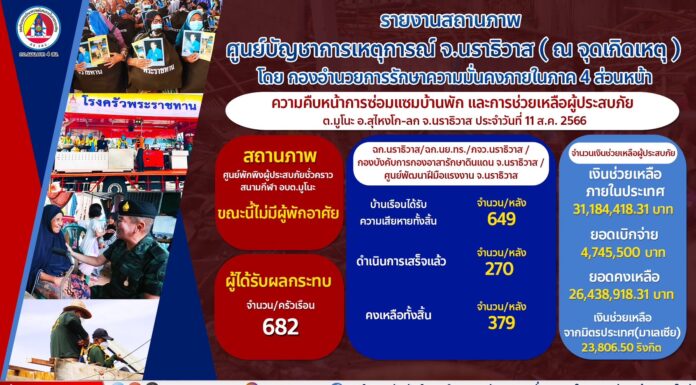 กอ.รมน.ภาค 4 สน. รายงานสถานภาพการซ่อมแซมบ้านพัก และการช่วยเหลือผู้ประสบภัยบริเวณตลาดมูโนะ อ.สุไหงโก – ลก จ.นราธิวาส ประจำวันที่ 11 ส.ค.66 ล่าสุดคืบหน้าซ่อมแซมและส่งมอบบ้านแล้ว 270 หลัง