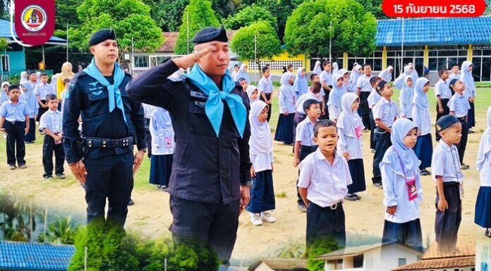 วันที่ 15 กันยายน 2568 เวลา 08.00 น. กองร้อยทหารพรานที่ 4912 หน่วยเฉพาะกิจกรมทหารพรานที่ 49 นำโดย จ่าสิบเอก สุนัย ไพบูลย์ หัวหน้าส่วนการเมือง ชุดปฏิบัติการกิจการพลเรือนที่ 4912 ลงพื้นที่โรงเรียนบ้านดาฮง หมู่ที่ 4 ตำบลเชิงคีรี อำเภอศรีสาคร จังหวัดนราธิวาส เจ้าหน้าที่ร่วมกับคณะครูและนักเรียน จัดกิจกรรม “เสาธง 5 นาที” โดยช่วยจัดระเบียบแถว นำนักเรียนร้องเพลงชาติ และเชิญธงชาติขึ้นสู่ยอดเสา เพื่อเสริมสร้างความภาคภูมิใจ และปลูกฝังจิตสำนึกแห่งการเทิดทูน ชาติ ศาสนา พระมหากษัตริย์ ให้กับเด็กและเยาวชน
