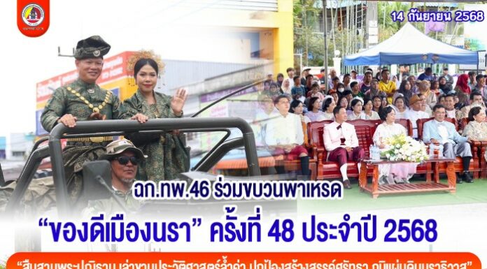 พันเอก สิทธิชัย บำรุงเขต ผู้บังคับหน่วยเฉพาะกิจกรมทหารพรานที่ 46 พร้อมด้วย คุณจริยา สราญจิตต์ ประธานสมาคมแม่บ้านทหารบก สาขากรมทหารพรานที่ 46 และกำลังพลของหน่วย ร่วมเดินขบวนพาเหรดในงาน “ของดีเมืองนรา” ครั้งที่ 48 ซึ่งจัดขึ้นระหว่างวันที่ 13 – 22 กันยายน 2568 ณ สวนสาธารณะเฉลิมพระเกียรติ 6 รอบ พระชนมพรรษา อำเภอเมือง จังหวัดนราธิวาส