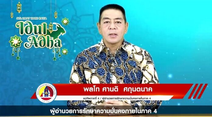 พลโท ศานติ ศกุนตนาค แม่ทัพภาคที่ 4 /ผู้อำนวยการรักษาความมั่นคงภายในภาค 4 ขอแสดงความยินดีและขอส่งความปรารถนาดี มายังทุกท่าน ที่ได้เข้าสู่ช่วงเวลาอันสำคัญยิ่งของศาสนาอิสลาม ซึ่งเป็นช่วงเวลาแห่งการกระทำความดี สร้างความรัก ร่วมกันกล่าวสรรเสริญและขอพรน้อมรับความเมตตาจากองค์อัลเลาะห์พระผู้เป็นเจ้า รวมทั้งเป็นโอกาสอันดีที่ท่านจะได้ปฏิบัติศาสนกิจตามหลักธรรมคำสั่งสอนของศาสนา ในเรื่องของการเสียสละ แบ่งปันให้กับครอบครัว ญาติพี่น้อง