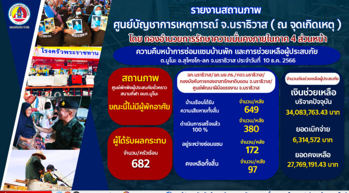 ผ่านมาแล้วกว่าสี่เดือนที่เจ้าหน้าที่ทุกภาคส่วนยังคงระดมกำลังเข้าซ่อมแซมที่อยู่อาศัยช่วยเหลือพี่น้องชาวมูโนะอย่างเต็มกำลังความสามารถ โดยศูนย์บัญชาการเหตุการณ์จังหวัดนราธิวาส ได้รายงานความคืบหน้า และภาพรวมการช่วยเหลือจากหน่วยงานที่เกี่ยวข้อง เข้าซ่อมแซมบ้านเรือนและช่วยเหลือในด้านต่างๆ ต่อเนื่องโดยกองอำนวยการรักษาความมั่นคงภายในภาค 4 ส่วนหน้า ยังคงสนับสนุนกำลังพลจิตอาสาชุดช่างพร้อมอุปกรณ์ กว่า 600 นาย ร่วมกับองค์กรปกครองส่วนท้องถิ่น รัฐวิสาหกิจ ภาคเอกชน และองค์กรสาธารณกุศล ทั้งในพื้นที่และนอกพื้นที่จังหวัดนราธิวาส รวมทั้งสิ้น 833 คน เข้าช่วยเหลือรื้อถอนสิ่งปลูกสร้าง และอื่นๆ โดยข้อมูลวันที่ 10 ธันวาคม 2566 พบว่าทุกภาคส่วนได้ซ่อมแซมบ้านและส่งมอบบ้านให้ผู้ประสบภัยได้กลับเข้าพักอาศัยในบ้านของตัวเองแล้วกว่า300 หลังคาเรือน