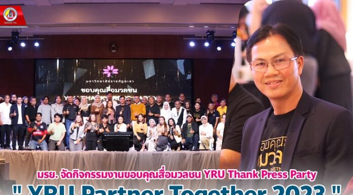 เมื่อวันที่ 7 กันยายน 2566 เวลา 18.30 น. ณ หอประชุมเล็ก มหาวิทยาลัยราชภัฏยะลา ผู้ช่วยศาสตราจารย์ ดร.ศิริชัย นามบุรี รักษาราชการแทนอธิการบดีมหาวิทยาลัยราชภัฏยะลา ร่วมงานขอบคุณสื่อมวลชน YRU Thank Press Party "YRU Partner Together 2023 " เพื่อสร้างความสัมพันธ์ ความร่วมมือตลอดจนสร้างเครือข่ายการประชาสัมพันธ์ แลกเปลี่ยนข้อมูลข่าวสารความคิดเห็นเกี่ยวกับการดำเนินงานและการพัฒนา มหาวิทยาลัย และเพื่อขอบคุณสื่อมวลชนทุกแขนง นักประชาสัมพันธ์ และเครือข่ายประชาสัมพันธ์ที่เป็น สื่อกลางในการนำเสนอข่าวสาร ตลอดจนสนับสนุนมหาวิทยาลัยราชภัฏยะลามาตลอด โดยมี สื่อมวลชนจังหวัดยะลา คณะผู้จัด คณาจารย์ นักศึกษา เข้าร่วมงานเป็นจำนวนมาก บรรยากาศเป็นไปด้วยความอบอุ่น