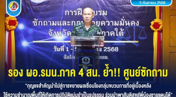รอง ผอ.รมน.ภาค 4 สน. ย้ำ“ศูนย์ซักถาม” กุญแจสำคัญนำไปสู่การขยายผลเชื่อมโยงกลุ่มขบวนการที่อยู่เบื้องหลัง ใช้ความชำนาญพื้นที่ให้เกิดการปฏิบัติแม่นยำเป็นรูปธรรม ร่วมนำพาสันติสุขสู่พี่น้องชายแดนใต้