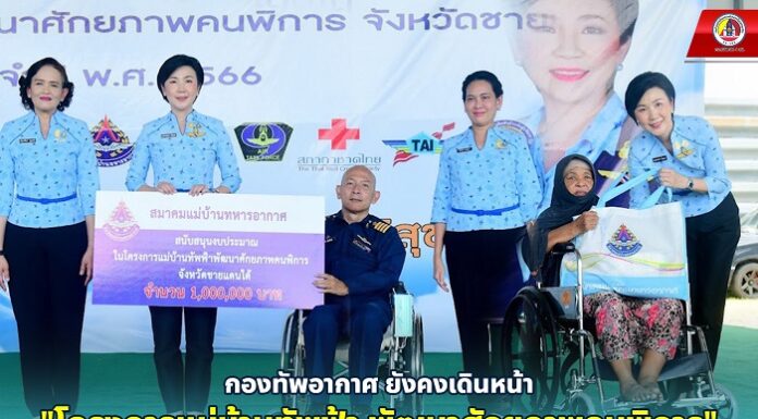 กองทัพอากาศ ยังคงเดินหน้า “โครงการแม่บ้านทัพฟ้า พัฒนาศักยภาพคนพิการ” ครั้งที่ 7 ประจำปี 2566 เน้นการส่งเสริมและพัฒนาศักยภาพผู้พิการในสามจังหวัดชายแดนภาคใต้ เพื่อยกระดับคุณภาพชีวิตของประชาชนผู้พิการ