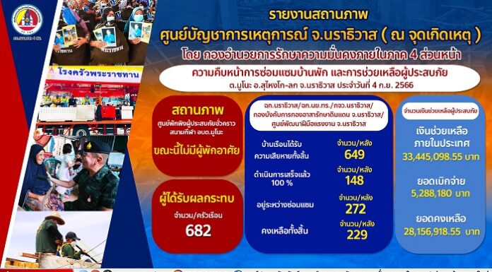 กองอำนวยการรักษาความมั่นคงภายในภาค 4 ส่วนหน้า โดยหน่วยเฉพาะกิจนราธิวาส , หน่วยเฉพาะกิจนาวิกโยธิน กองทัพเรือ, ตำรวจภูธรจังหวัดนราธิวาส ,กองบังคับการกองอาสารักษาดินแดน จังหวัดนราธิวาส และศูนย์พัฒนาฝีมือแรงงาน จังหวัดนราธิวาส เร่งเข้าให้การช่วยเหลือผู้ประสบภัยอย่างต่อเนื่อง เพื่อบรรเทาความเดือนร้อนอย่างทันท่วงที โดยได้เร่งช่วยเหลือในด้านต่างๆ ล่าสุดเจ้าหน้าที่ทุกภาคส่วน ได้เร่งทำการซ่อมแซมบ้านเรือนจนแล้วเสร็จ 100 % และส่งมอบแล้ว จำนวน 148 หลัง อยู่ระหว่างซ่อมแซม จำนวน 272 หลัง จากจำนวนบ้านเรือนได้รับความเสียหาย 649 หลัง คงเหลือทั้งสิ้น จำนวน 229 หลัง ซึ่งเจ้าหน้าที่ยังคงเร่งดำเนินการให้เร็วที่สุด