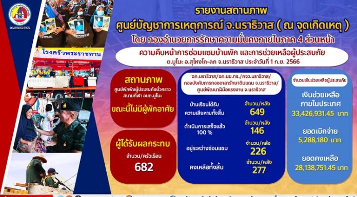 ระยะเวลากว่า 1 เดือนเต็ม จากเหตุการณ์โกดังเก็บดอกไม้เพลิงระเบิด ที่ ต.มูโนะ อ.สุไหงโก-ลก จ.นราธิวาส สร้างความเสียหายทั้งชีวิตและทรัพย์สินของประชาชนที่พักอาศัยอยู่บริเวณโดยรอบกว่า 680 ครัวเรือน ตลอดระยะเวลาตั้งแต่เมื่อวันที่ 29 กรกฎาคม 2566 กองอำนวยการรักษาความมั่นคงภายในภาค 4 ส่วนหน้า โดย หน่วยเฉพาะกิจนราธิวาส, หน่วยเฉพาะกิจนาวิกโยธิน กองทัพเรือ, ตำรวจภูธรจังหวัดนราธิวาส, กองบังคับการกองอาสารักษาดินแดน จังหวัดนราธิวาส และทุกภาคส่วนในพื้นที่จังหวัดนราธิวาส เข้าให้การช่วยเหลือผู้ประสบภัยเพื่อบรรเทาความเดือนร้อน โดยเฉพาะในด้านการซ่อมแซมที่พักอาศัยที่ได้รับความเสียหายจำนวน 649 หลัง ล่าสุด เจ้าหน้าที่เร่งมือซ่อมแซมบ้านเรือนผู้ประสบภัยมูโนะ ปัจจุบัน (1 กันยายน 2566) ดำเนินการซ่อมแซมแล้วเสร็จ 100% จำนวน 146 หลัง อยู่ในระหว่างซ่อมแซมอีกจำนวน 226 หลัง ยังคงเหลือ 277 หลัง ซึ่งเจ้าหน้าที่ยังคงเร่งดำเนินการให้เร็วที่สุด นอกจากนี้ยังได้ลงพื้นที่เยียวยาทางด้านสภาพจิตใจ รวมถึงการส่งเสริมในด้านอาชีพเพื่อสร้างรายได้ในการเลี้ยงชีพและครอบครัวอย่างยั่งยืนอีกด้วย