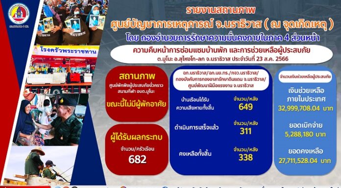 กว่า 25 วันแล้วจากเหตุการณ์โกดังเก็บดอกไม้เพลิงระเบิด ที่ ต.มูโนะ อ.สุไหงโก-ลก จ.นราธิวาส สร้างความเสียหายทั้งชีวิตและทรัพย์สินของประชาชนที่พักอาศัยอยู่บริเวณโดยรอบกว่า 680 ครัวเรือน ตลอดระยะเวลาตั้งแต่เมื่อวันที่ 29 กรกฎาคม 2566 เวลา 15.05 น. กองอำนวยการรักษาความมั่นคงภายในภาค 4 ส่วนหน้า โดยหน่วยเฉพาะกิจนราธิวาส , หน่วยเฉพาะกิจนาวิกโยธิน กองทัพเรือ, ตำรวจภูธรจังหวัดนราธิวาส ,กองบังคับการกองอาสารักษาดินแดน จังหวัดนราธิวาส และศูนย์พัฒนาฝีมือแรงงาน จังหวัดนราธิวาส เร่งเข้าให้การช่วยเหลือผู้ประสบภัยอย่างต่อเนื่อง เพื่อบรรเทาความเดือนร้อนอย่างทันท่วงที โดยได้เร่งช่วยเหลือในด้านต่างๆ ล่าสุดรายงานเมื่อวันที่ 23 สิงหาคม 2566 เวลา 18.00 น. ได้เร่งทำการซ่อมแซมบ้านเรือนจนแล้วเสร็จและส่งมอบแล้ว จำนวน 311 หลัง จากในจำนวนบ้านเรือนได้รับความเสียหาย 649 หลัง ยังคงเหลืออีก 338 หลัง ซึ่งเจ้าหน้าที่ยังคงเร่งดำเนินการให้เร็วที่สุด
