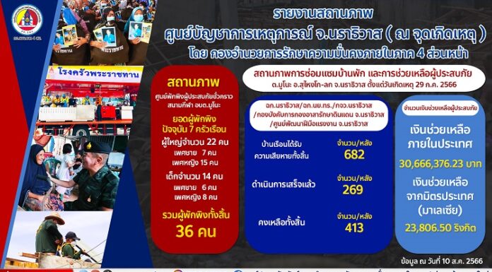 กองอำนวยการรักษาความมั่นคงภายในภาค 4 ส่วนหน้า โดยหน่วยเฉพาะกิจนราธิวาส , หน่วยเฉพาะกิจนาวิกโยธิน กองทัพเรือ, ตำรวจภูธรจังหวัดนราธิวาส ,กองบังคับการกองอาสารักษาดินแดน จังหวัดนราธิวาส และ ศูนย์พัฒนาฝีมือแรงงาน จังหวัดนราธิวาส เร่งดำเนินการซ่อมแซมบ้านเรือนให้กับผู้ประสบภัย เพื่อบรรเทาความเดือดร้อนแก่พี่น้องชาวมูโนะ ล่าสุด วันที่ 10 สิงหาคม 2566 ดำเนินการเรียบร้อยแล้ว จำนวน 269 หลัง และคงเหลืออีกจำนวน 413 หลัง