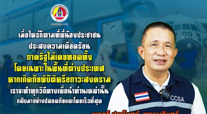 “เมื่อไหร่ก็ตามที่พี่น้องประชาชน ประสบความเดือดร้อน ภาครัฐไม่เคยทอดทิ้ง โดยเฉพาะในพื้นที่ต่างประเทศ หากเกิดภัยพิบัติหรือภาวะสงคราม เราจะทำทุกวิถีทางเพื่อนำท่านเหล่านั้น กลับมาอย่างปลอดภัยและโดยเร็วที่สุด”