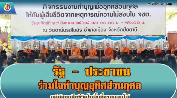 วันนี้ (17 สิงหาคม 2568) เวลา 10.00 น. ณ วัดตานีนรสโมสร อำเภอเมืองปัตตานี จังหวัดปัตตานี พลโทไพศาล หนูสังข์ แม่ทัพภาคที่ 4/ผู้อำนวยการรักษาความมั่นคงภายในภาค 4 เข้าร่วมกิจกรรมทำบุญอุทิศส่วนกุศลแด่ผู้เสียชีวิตจากเหตุการณ์ความไม่สงบในพื้นที่จังหวัดชายแดนภาคใต้ พร้อมทั้งพบปะและให้กำลังใจแก่ครอบครัวผู้ได้รับผลกระทบ โดยมี พันตำรวจเอก ทวี สอดส่อง รัฐมนตรีว่าการกระทรวงยุติธรรม เป็นประธานในพิธีฝ่ายฆราวาส ร่วมด้วย พันตำรวจโท วรรณพงษ์ คชรักษ์ เลขาธิการศูนย์อำนวยการบริหารจังหวัดชายแดนภาคใต้ , ผู้ว่าราชการจังหวัดปัตตานี หัวหน้าส่วนราชการ และพุทธศาสนิกชนในพื้นที่เข้าร่วมอย่างพร้อมเพรียง