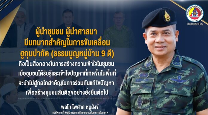 “…ผู้นำชุมชน ผู้นำศาสนา มีบทบาทสำคัญในการขับเคลื่อนฮูกุมปากัต (ธรรมนูญหมู่บ้าน 9 ดี) ถือเป็นสื่อกลางในการสร้างความเข้าใจในชุมชนเมื่อชุมชนได้รับรู้และเข้าใจปัญหาที่เกิดขึ้นในพื้นที่ จะนำไปสู่กลไกสำคัญในการร่วมกันแก้ไขปัญหา เพื่อสร้างชุมชนสันติสุขอย่างยั่งยืนต่อไป…”