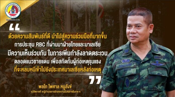 “…ด้วยความสัมพันธ์ที่ดี นำไปสู่ความร่วมมือที่มากขึ้น การประชุม RBC ที่ผ่านมาฝ่ายไทยและมาเลเซีย มีความเห็นร่วมกัน ในการเพิ่มกำลังลาดตระเวน ตลอดแนวชายแดน เพื่อสกัดกั้นผู้ก่อเหตุรุนแรง ที่จะหลบหนีเข้าไปยังประเทศมาเลเซียหลังก่อเหตุ…”