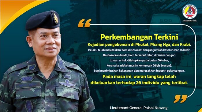 “…Perkembangan Terkini Kejadian pengeboman di Phuket, Phang Nga, dan Krabi. Pelaku telah meletakkan bom di 12 lokasi dengan jumlah keseluruhan 16 butir. Berdasarkan bukti, bom tersebut telah ditanam dengan...