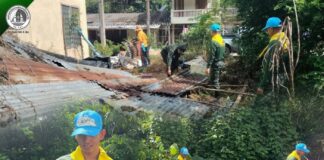 กองพันทหารราบที่ 1 กรมทหารราบที่ 152 จัดกำลังพลจิตอาสาเข้าช่วยเหลือประชาชน หลังคาโรงรถพังจากพายุลมแรงในพื้นที่ ต.อัยเยอร์เวง อ.เบตง จ.ยะลา