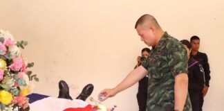 ขอไว้อาลัยแด่ดวงจิตวิญญาณ และสดุดีวีรชนทหารกล้า ผู้วายชนม์ เสียชีวิตจากการปฏิบัติหน้าที่จวบจนวาระสุดท้ายของชีวิต พร้อมรดน้ำศพ ส่งศพ ผู้ล่วงลับกลับมาตุภูมิอย่างสมเกียรติ
