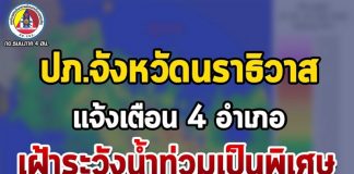 ปภ.จังหวัดนราธิวาส แจ้งเตือน 4 อำเภอในพื้นที่ เฝ้าระวังน้ำท่วมเป็นพิเศษ พร้อมฝากห้ามลงเล่นน้ำ ขณะที่ภาพรวมมีฝนตกต่อเนื่อง พื้นที่ประสบภัย 9 อำเภอ ทุกภาคส่วนเร่งให้การช่วยเหลือ