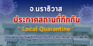 จ.นราธิวาส ประกาศสถานที่กักกัน Local Quarantine เพื่อเตรียมพร้อมรองรับผู้เข้ากักกันตัวให้มีความเหมาะสมและจำนวนเพียงพอ