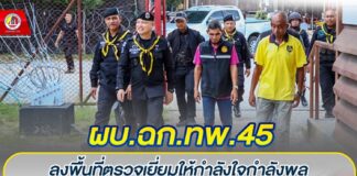 พันเอก สุรศักดิ์ พึ่งแย้ม ผู้บังคับหน่วยเฉพาะกิจกรมทหารพรานที่ 45 พร้อมด้วย พันเอก ณัฐภูมิ ฉัตรภูมิ รองผู้บังคับหน่วยเฉพาะกิจกรมทหารพรานที่ 45 และฝ่ายอำนวยการ ลงพื้นที่ตรวจเยี่ยมให้กำลังใจ ชุดปฏิบัติการทหารพราน และ กำลังอาสาสมัครประจำพื้นที่ ในการปฏิบัติหน้าที่รักษาความปลอดภัยเส้นทางรถไฟ ในพื้นที่อำเภอระแงะ จังหวัดนราธิวาส ตลอดจนได้สอบถามปัญหาข้อขัดข้องในการปฏิบัติงาน ทั้งนี้ เพื่อกำกับดูแลและเน้นย้ำการปฏิบัติให้เป็นไปตามนโยบายและสั่งการของ แม่ทัพภาคที่...