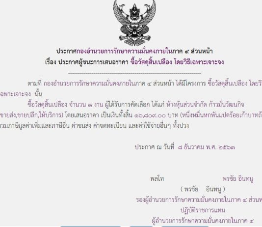ประกาศผู้ชนะการเสนอราคา ซื้อวัสดุอุปกรณ์เครื่องใช้สำนักงาน ของหน่วย ฉก.ทพ.๓๐ โดยวิธีเฉพาะเจาะจง ( ๒๐๒,๓๐๘.๐๐ บาท )