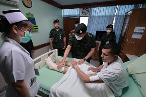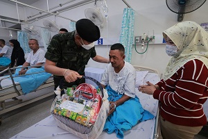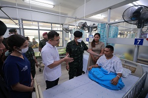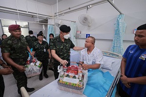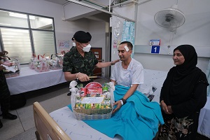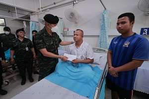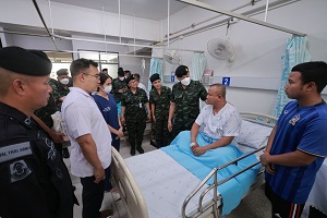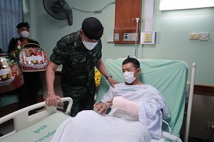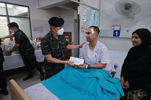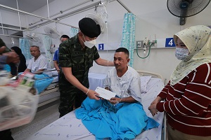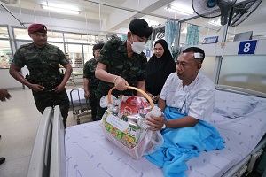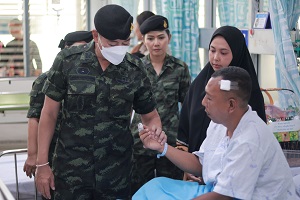 จากนั้น เดินทางต่อไปที่โรงพยาบาลนราธิวาสราชนครินทร์ ตำบลบางนาค อำเภอเมือง จังหวัดนราธิวาส เข้าเยี่ยมกำลังพลจำนวน 5 นาย ที่ได้รับบาดเจ็บจากเหตุการณ์ล่าสุด เมื่อช่วงกลางดึกของวันที่ 7 เมษายน 2567 ที่ผ่านมา มีคนร้ายไม่ทราบจำนวน ใช้อาวุธไม่ทราบชนิดและขนาด ซุ่มยิงใส่รถยนต์ของเจ้าหน้าที่กองร้อยทหารพรานที่ 4613 สังกัดหน่วยเฉพาะกิจกรมทหารพรานที่ 46 จำนวน 2 คัน ขณะเดินทางกลับจากการปฏิบัติภารกิจตรวจเยี่ยมการจัดทำซุ้มประตูชัย (ปินตูกรือบัน) ในพื้นที่บ้านบลูกาฮีเล หมู่ที่ 6 ตำบลบาตง อำเภอรือเสาะ จังหวัดนราธิวาส ได้แก่ อาสาสมัครทหารพราน สามะแอ ดือมาสิ, อาสาสมัครทหารพราน สมาน ลีอาแด, ร้อยเอก ชัยยุทธ สุกบู, อาสาสมัครทหารพราน อาดนัย สุหลง และสิบเอก สุรเดช สังขวงค์ ซึ่งขณะนี้อาการปลอดภัยแล้ว และยังเป็นเหตุให้เจ้าหน้าที่เสียชีวิตจากเหตุการณ์ดังกล่าว จำนวน 2 นาย คือ อาสาสมัครทหารพราน วิทยา ปวงงาม อายุ 30 ปี และอาสาสมัครทหารพราน ประคอง สุทนัง อายุ 48 ปี และมีเจ้าหน้าที่ได้รับบาดเจ็บอีกจำนวน 4 นาย ขณะนี้เข้ารับการรักษาตัวอยู่ที่โรงพยาบาลสงขลานครินทร์ อำเภอหาดใหญ่ จังหวัดสงขลา