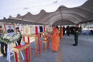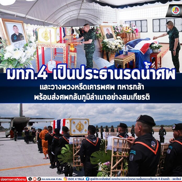 โอกาสนี้ แม่ทัพภาคที่ 4 / ผู้อำนวยการรักษาความมั่นคงภายในภาค 4 ได้วางพวงหรีดเคารพศพในนามของ นายเศรษฐา ทวีสิน นายกรัฐมนตรี ในฐานะผู้อำนวยการรักษาความมั่นคงภายในราชอาณาจักร, นายสุทิน คลังแสง รัฐมนตรีว่าการกระทรวงกลาโหม , พลเอก เจริญชัย หินเธาว์ ผู้บัญชาการทหารบก /รองผู้อำนวยการรักษาความมั่นคงภายในราชอาณาจักร และวางพวงหรีดเคารพศพในนามของแม่ทัพภาคที่ 4 / ผู้อำนวยการรักษาความมั่นคงภายในภาค 4 พร้อมกันนี้ ยังมอบเหรียญบางระจันและใบประกาศนียบัตร เพื่อเป็นการประกาศเกียรติคุณ เชิดชูเกียรติ ในการประกอบคุณงามความดีและความเสียสละของผู้เสียชีวิต ก่อนมอบเงินช่วยเหลือเบื้องต้นส่งความเสียใจอย่างสุดซึ้งไปยังครอบครัวของผู้เสียชีวิตทั้ง 2 นาย โดยมี พลตำรวจโท ปิยะวัฒน์ เฉลิมศรี ผู้บัญชาการตำรวจภูธรภาค 9 , พลตรี เฉลิมพร ขำเขียว ผู้บัญชาการกองพลทหารราบที่ 15 / ผู้บังคับหน่วยเฉพาะกิจนราธิวาส , พันเอก สถิรพงษ์ อาจหาญ ผู้บังคับกองกำลังทหารพรานจังหวัดชายแดนภาคใต้, ผู้บังคับการกรมทหารพราน ,ผู้แทนศูนย์อำนวยการบริหารจังหวัดชายแดนภาคใต้ , หัวหน้าส่วนราชการ ทหาร ตำรวจ เพื่อนข้าราชการต่างร่วมแสดงความอาลัย
