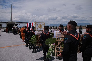 ต่อมาเวลา 10.45 น. ได้เคลื่อนขบวนศพ เพื่อกระทำพิธีส่งศพไปประกอบพิธีทางศาสนายังภูมิลำเนา อำเภอนาจะหลวย จังหวัดอุบลราชธานี และ อำเภอเมืองพะเยา จังหวัดพะเยา ตามลำดับ ณ หมวดบินเฉพาะกิจภาคใต้ กองการบินทหารเรือ บ้านทอน ตำบลโคกเคียน อำเภอเมืองนราธิวาส จังหวัดนราธิวาส อย่างสมเกียรติ ด้วยเครื่องบินลำเลียงแบบ C-295 ของกองทัพบก