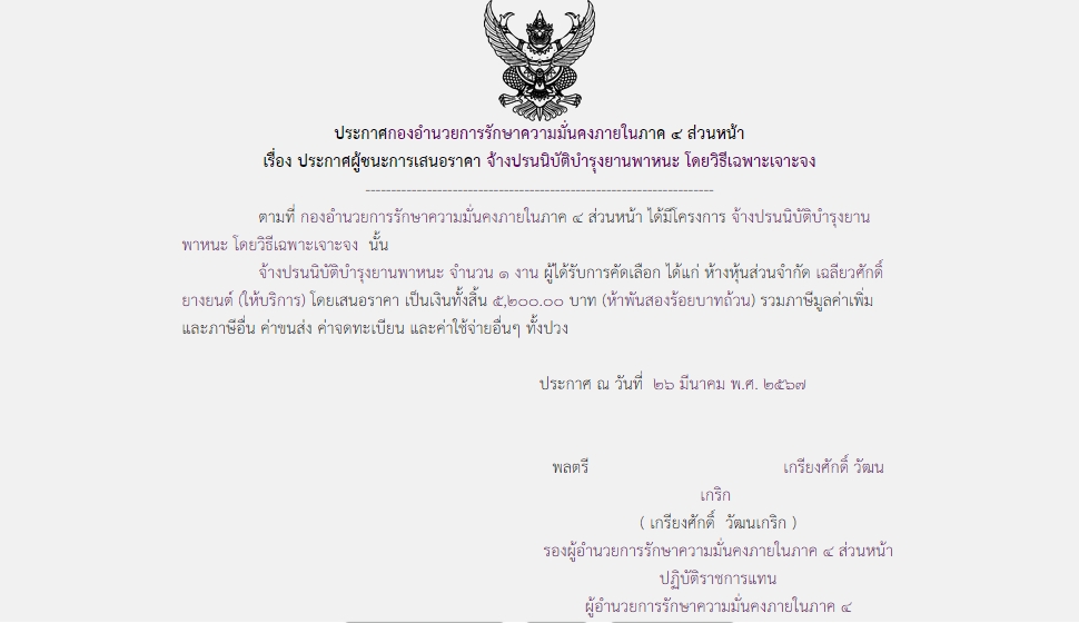ประกาศผู้ชนะการเสนอราคา จ้างปรนนิบัติบำรุงยานพาหนะ โดยวิธีเฉพาะเจาะจง