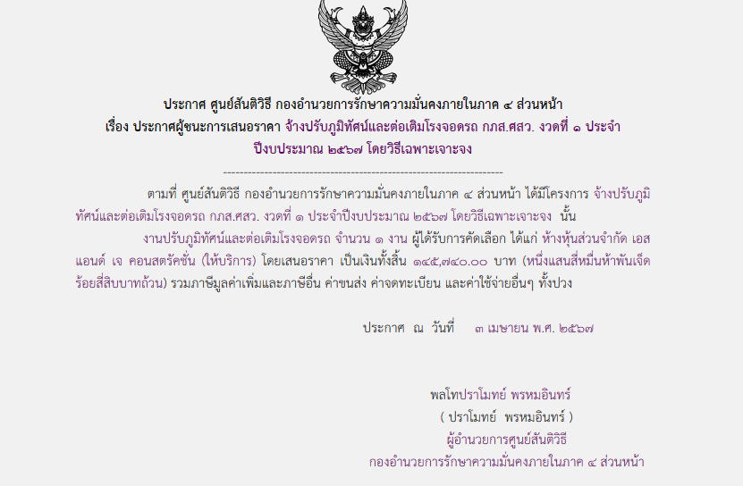 จัดซื้อ จัดจ้างประกาศผู้ชนะการเสนอราคา ประกาศผู้ชนะการเสนอราคา จ้างปรับภูมิทัศน์และต่อเติมโรงจอดรถ กภส.ศสว. งวดที่ ๑ ประจำ ปีงบประมาณ ๒๕๖๗ โดยวิธีเฉพาะเจาะจง April 10, 2024 463 Share Facebook Twitter Google+ Telegram LINE
