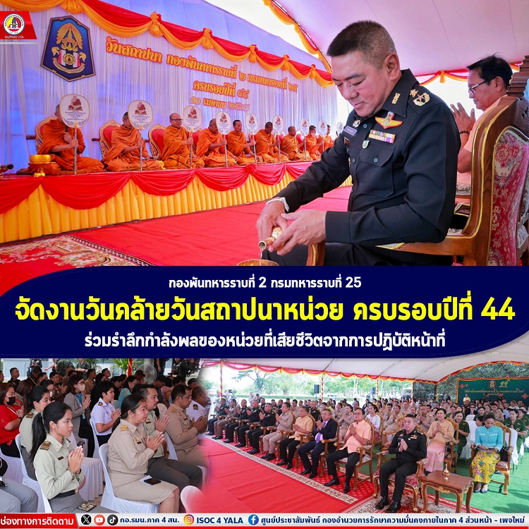เมื่อวันที่ (10 เม.ย.67) เวลา 10.00 น. ที่ กองบังคับการกองพันทหารราบที่ 2 กรมทหารราบที่ 25 ค่ายรัตนรังสรรค์ ตำบลราชกรูด อำเภอเมือง จังหวัดระนอง พลโทศานติ ศกุนตนาค แม่ทัพภาคที่ 4 เป็นประธานในพิธีวันคล้ายวันสถาปนาหน่วย โดยมี ผู้ว่าราชการจังหวัดระนอง อดีตผู้บังคับบัญชา หัวหน้าส่วนราชการทหาร ตำรวจ ประชาชน เข้าร่วมในพิธี โดยพลโทศานติ ศกุนตนาค แม่ทัพภาคที่ 4 ได้จุดธูปเทียน เครื่องทองน้อย บูชาพระรัตนตรัย มีพระครูอุปนันทโสภณ เจ้าคณะอำเภอเมืองระนอง เจ้าอาวาสวัดอุปนันทาราม จังหวัดระนอง เป็นประธานฝ่ายสงฆ์ ในการเจริญพระพุทธมนต์ พร้อมประกอบพิธีทอดผ้าบังสุกุล อุทิศบุญกุศลให้แก่ทหารผู้กล้าที่เสียชีวิตจากการปฏิบัติหน้าที่ โดยกิจกรรมในครั้งนี้ได้มอบทุนการศึกษาให้กับบุตร หลาน , มอบรางวัลกำลังพล ดีเด่นของหน่วย ,และมอบของท่ระลึกให้กับผู้ร่วมงาน
