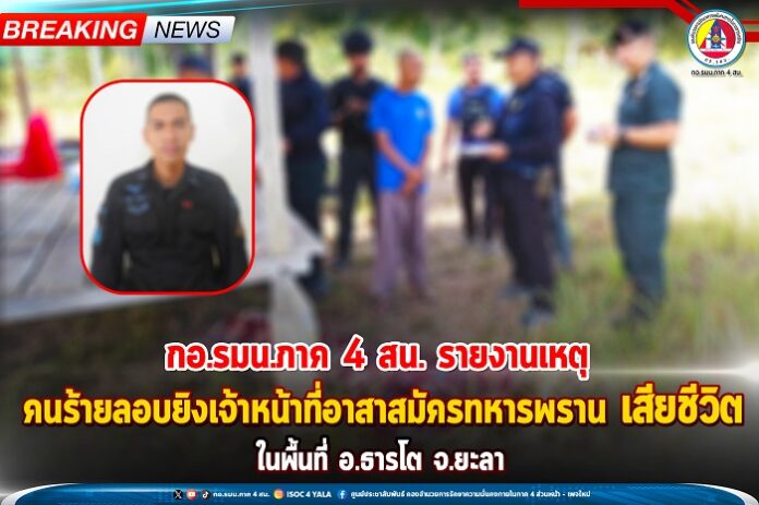 วันนี้ 17 เมษายน 2567 เวลา 06.20 น. เกิดเหตุคนร้ายได้ใช้อาวุธปืนลอบยิง อาสาสมัครทหารพราน รุสลี ดาเล็ง อายุ 43 ปี สังกัด กองร้อยทหารพรานที่ 4716 หน่วยเฉาะกิจกรมทหารพรานที่ 47 เสียชีวิตภายในพื้นที่ อำเภอธารโต จังหวัดยะลา โดยเมื่อวันที่ 13 เมษายน 2567 อาสาสมัครทหารพราน รุสลี ดาเล็ง ได้ขออนุญาตลากิจกับ ผู้บังคับกองร้อยฯ ตั้งแต่วันที่ 13-20 เมษายน 2567 เพื่อไปเยี่ยมดูอาการพ่อซึ่งป่วย และต่อมาเสียชีวิต เมื่อวันที่ 14 เมษายน 2567 จึงอยู่ร่วมงานศพของบิดา จนกระทั่งวันที่ 17 เมษายน 2567 เวลา 06.20 น. ได้ประกอบพิธีทางศาสนา ณ กุโบร์ บ้านจาเราะแป หมู่ที่ 3 ตำบลธารโต อำเภอธารโต จังหวัดยะลา ระหว่างนั้น ได้มีคนร้ายไม่ทราบจำนวน ใช้อาวุธปืนพกขนาด 9 มิลลิเมตร ลอบยิงเข้าใส่ขณะกำลังอ่านคัมภีร์อัลกรุอ่านให้กับบิดาที่ล่วงลับไปแล้ว กระสุนถูกบริเวณศีรษะ ทำให้เสียชีวิตในที่เกิดเหตุ จากการตรวจสอบพบปลอกกระสุนปืนพกขนาด 9 มิลลิเมตร จำนวน 1 ปลอก ตกอยู่ในบริเวณที่เกิดเหตุ ล่าสุดเจ้าหน้าที่ได้เข้าทำการตรวจสอบและควบคุมพื้นที่เกิดเหตุเพื่อขยายผลติดตามตัวคนร้ายมาดำเนินคดีตามกฎหมายโดยเร็วที่สุด สำหรับความคืบหน้าจะรายงานให้ทราบต่อไป