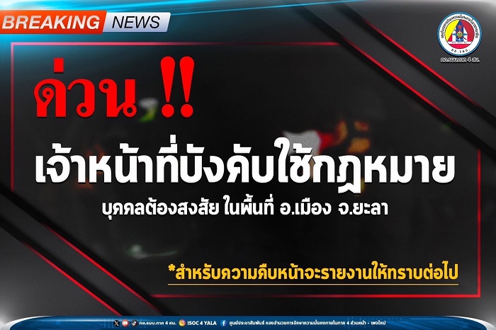 เมื่อวันที่ 17 เมษายน 2567 เวลา 04.00 น. หน่วยปฏิบัติการพิเศษร่วมประจำจังหวัดยะลา ได้สนธิกำลัง 3 ฝ่าย เข้าบังคับใช้กฎหมายเพื่อตรวจสอบบุคคลต้องสงสัย ในพื้นที่อำเภอเมือง จังหวัดยะลา ปัจจุบันเจ้าหน้าที่อยู่ระหว่างดำเนินการ สำหรับความคืบหน้าจะรายงานให้ทราบต่อไป