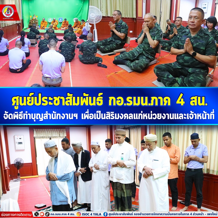 วันนี้ (18 เมษายน 2567) ที่ ห้องแถลงข่าว ศูนย์ประชาสัมพันธ์ กองอำนวยการรักษาความมั่นคงภายในภาค 4 ส่วนหน้า ตำบลเขาตูม อำเภอยะรัง จังหวัดปัตตานี พลโท ปราโมทย์ พรหมอินทร์ แม่ทัพน้อยที่ 4 / รองผู้อำนวยการรักษาความมั่นคงภายในภาค 4 ส่วนหน้า / ผู้อำนวยการศูนย์สันติวิธี เป็นประธานในพิธีทำบุญสำนักงานศูนย์ประชาสัมพันธ์กองอำนวยรักษาความมั่นคงภายในภาค 4 ส่วนหน้า และทำบุญขึ้นปีใหม่ พุทธศักราช 2567 พร้อมด้วย พลตรี กรกฎ ภู่โชติ รองผู้อำนวยการรักษาความมั่นคงภายในภาค 4 ส่วนหน้า เพื่อความเป็นสิริมงคลแก่เจ้าหน้าที่ในการปฎิบัติงานในพื้นที่จังหวัดชายแดนภาคใต้ โดยมี พันเอก ปองเชษฐ์ พูนช่วย ผู้อำนวยการสำนักมวลชนและกิจการพิเศษ กองอำนวยการรักษาความมั่นคงภายในภาค 4 ส่วนหน้า, พันเอก นราธิป จอง ผู้อำนวยการสำนักสารสนเทศ กองอำนวยการรักษาความมั่นคงภายในภาค 4 ส่วนหน้า, พันเอก เอกวริทธิ์ ชอบชูผล หัวหน้าศูนย์ประชาสัมพันธ์ กองอำนวยการรักษาความมั่นคงภายในภาค 4 ส่วนหน้า, ผู้บังคับบัญชา, กำลังพลและเจ้าหน้าที่ศูนย์ประชาสัมพันธ์กองอำนวยการรักษาความมั่นคงภายในภาค 4 ส่วนหน้า ร่วมในพิธีฯ