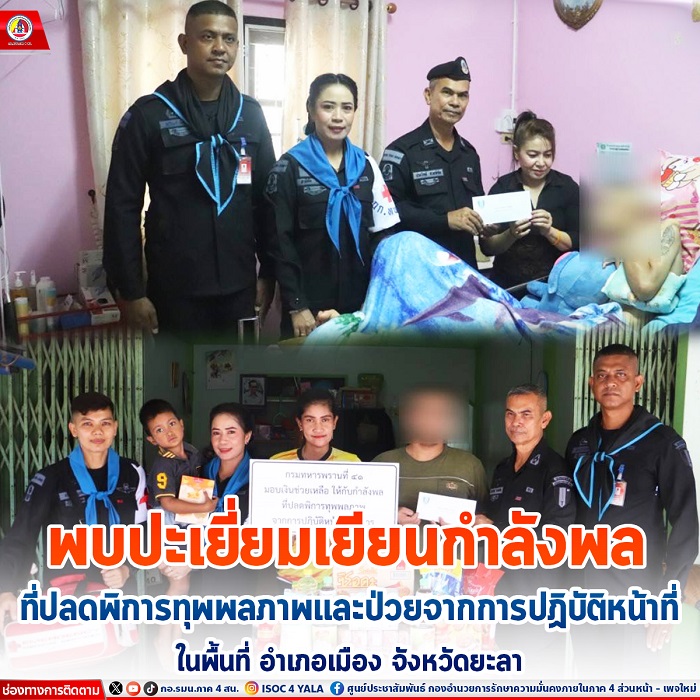 วันที่ 18 เมษายน 2567 เวลา 09.00 น. หน่วยเฉพาะกิจกรมทหารพรานที่ 41 โดยพันตรี ประวิทย์ ช่วยพิชัย รองผู้บังคับหน่วยเฉพาะกิจกรมทหารพรานที่ 41 พร้อมด้วยกำลังพล ชุดปฏิบัติการกิจการพลเรือน ลงพื้นที่พบปะเยี่ยมเยียนกำลังพลที่ปลดพิการทุพพลภาพ และกำลังพลที่ป่วยจากการปฏิบัติหน้าที่ราชการ ประจำเดือน เมษายน 2567 จำนวน 2 นาย ได้แก่ สิบโท อภิสิทธิ์ เกษมสุข กำลังพลที่ป่วยติดเตียง ซึ่งพักรักษาตัวที่ บ้านเลขที่ 28/7 ตำบลสะเตง อำเภอเมือง จังหวัดยะลา และ อาสาสมัครทหารพราน กัมปนาท จันทร์พรหมศรี กำลังพลที่ปลดพิการทุพพลภาพ พิการทางด้านร่างกายจากเหตุการณ์ความรุนแรงในพื้นที่จังหวัดชายแดนภาคใต้ ซึ่งพักอาศัยที่ บ้านเลขที่ 30 ตำบลสะเตง อำเภอเมือง จังหวัดยะลา เพื่อเป็นการสร้างขวัญกำลังใจให้กับกำลังพลและครอบครัว รวมถึงเป็นการตรวจเยี่ยมความเป็นอยู่ในปัจจุบัน เพื่อแสดงออกถึงความห่วงใยของผู้บังคับบัญชาที่มีต่อกำลังพล “เพราะเราคือครอบครัวเดียวกัน”