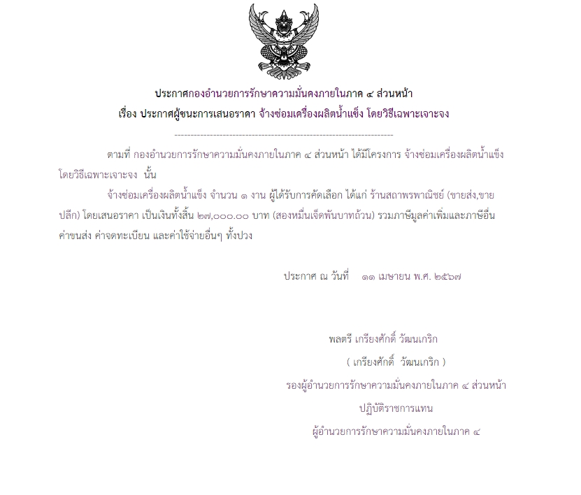 ประกาศผู้ชนะการเสนอราคา จ้างซ่อมเครื่องผลิตน้ำแข็ง โดยวิธีเฉพาะเจาะจง