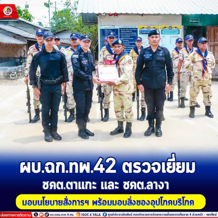 เมื่อวันที่ 19 เมษายน 2567 พันเอก สรรัศมิ์ นิลสลับ ผู้บังคับหน่วยเฉพาะกิจกรมทหารพรานที่ 42 ลงพื้นที่ตรวจเยี่ยม ชุดคุ้มครองตำบลตาแกะ ณ ฐานปฏิบัติการชุดคุ้มครองตำบลลางา หมู่ที่ 2 บ้านลางา ตำบลลางา อำเภอมายอ จังหวัดปัตตานี และชุดคุ้มครองตำบลลางา ณ ฐานปฏิบัติการชุดคุ้มครองตำบลตาแกะ หมู่ที่ 1 ตำบลตาแกะ อำเภอยะหริ่ง จังหวัดปัตตานี เพื่อติดตามเกี่ยวกับมาตรการ ในการกำกับดูแลรักษาความปลอดภัยพื้นที่บริเวณโดยรอบของฐานปฏิบัติการ พร้อมมอบนโยบายสั่งการของผู้บังคับบัญชา ชี้แจงการปฏิบัติ สอบถามความเป็นอยู่ เน้นย้ำข้อห้ามต่าง ๆ แจ้งเตือนข้อมูลข่าวสาร