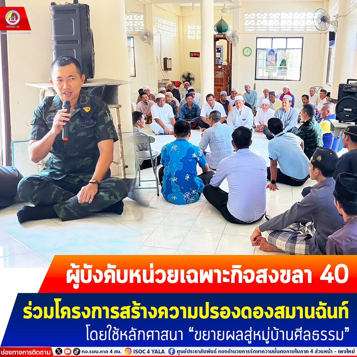 เมื่อวันที่ 19 เมษายน 2567 เวลา 13.10 น. ที่ มัสยิดควนติหมุน หมู่ที่ 7 ตำบลปากบาง อำเภอเทพา จังหวัดสงขลา พันโท ภูมิศักดิ์ ศักดิ์เพชร ผู้บังคับหน่วยเฉพาะกิจสงขลา 40 ร่วมพบปะพูดคุยกับผู้นำศาสนา ตามโครงการสร้างความปรองดองสมานฉันท์ โดยใช้หลักศาสนา “ขยายผลสู่หมู่บ้านศีลธรรม” เพื่อสร้างวัฒนธรรมการอยู่ร่วมกันด้วยความปรองดอง สมานฉันท์ เกิดความสันติสุขในหมู่บ้าน/ชุมชน พัฒนาไปสู่หมู่บ้านศีลธรรม ตลอดจนยกระดับคุณภาพชีวิตประชาชนโดยยึดถึงหลักศาสนาและนำมาใช้จนเป็นวิถีชีวิต