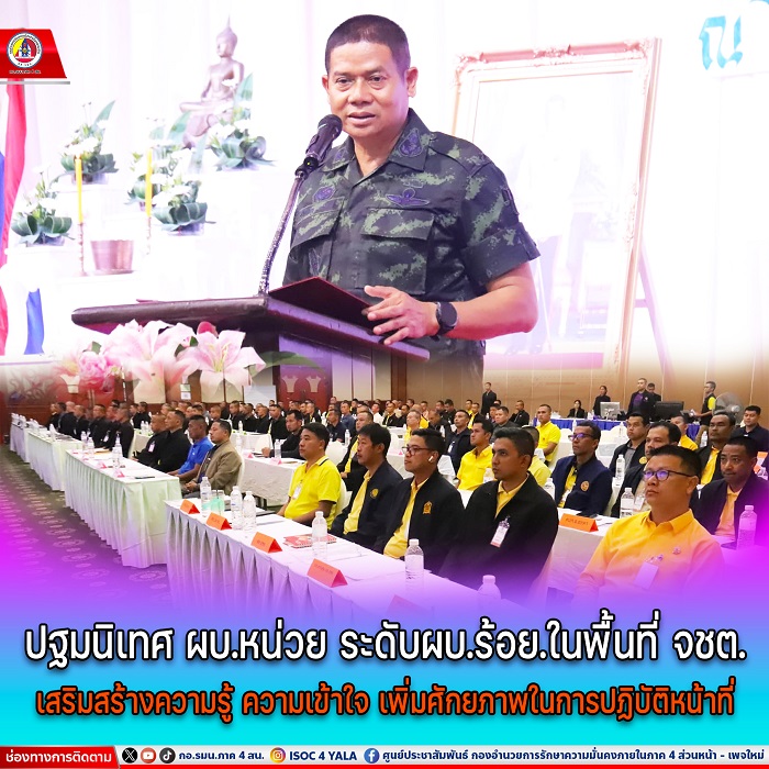 วันที่ 22 เมษายน 2567 เวลา 10.30 น. ที่ โรงแรมบีพี สมิหลา บีช โฮเทล แอนด์ รีสอร์ทอำเภอเมืองสงขลา จังหวัดสงขลา พลตรี ไพศาล หนูสังข์ รองแม่ทัพภาคที่ 4 / รองผู้อำนวยการรักษาความมั่นคงภายในภาค 4 ส่วนหน้า ร่วมรับฟังแถลงผลการสัมมนาฯ และเป็นประธานในพิธีเปิดการปฐมนิเทศ ผู้บังคับหน่วย ระดับผู้บังคับกองร้อย และผู้บังคับหมวดในพื้นที่จังหวัดชายแดนภาคใต้ ประจำปีงบประมาณ 2567 เพื่อให้ผู้เข้าร่วมการปฐมนิเทศฯได้รับทราบนโยบายของผู้บังคับบัญชาและแนวทางสำหรับการปฏิบัติงานในพื้นที่ จชต. เพื่อเสริมสร้างความรู้ ความเข้าใจ เกี่ยวกับนโยบาย ขอบเขตแนวทางการปฏิบัติ รวมทั้งยุทธศาสตร์ และยุทธวีธีของกลุ่มผู้ก่อเหตุรุนแรงในพื้นที่ จชต. นำไปประยุกต์ใช้ประโยชน์สำหรับการปฏิบัติงานในพื้นที่รับผิดชอบให้เกิดประสิทธิภาพ โดยมี ผู้แทนหน่วยในพื้นที่, ผู้แทนสำนักอำนวยการ กองอำนวยการรักษาความมั่นคงภายในภาค 4 ส่วนหน้า เข้าร่วมพิธีฯ และผู้เข้ารับการปฐมนิเทศฯ ประกอบด้วย ผู้บังคับกองร้อยและผู้บังคับหมวดในพื้นที่ จังหวัดยะลา ปัตตานี นราธิวาส และสงขลา