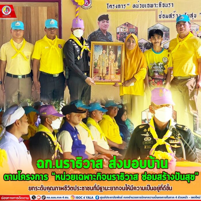 สำหรับโครงการ “หน่วยเฉพาะกิจนราธิวาส ซ่อมสร้างปันสุข” หน่วยเฉพาะกิจกรมทหารพรานที่ 49 ดำเนินการสร้างบ้าน ให้กับประชาชนในพื้นที่รับผิดชอบของหน่วย ที่มีฐานะยากจน เพื่อช่วยเหลือ และบรรเทาความเดือดร้อน ในด้านที่พักอาศัยและเสริมสร้างทัศนะคติที่ดี ของประชาชนในพื้นที่ ต่อเจ้าหน้าที่รัฐ โดยการคัดเลือก ใช้วิธีการคัดเลือกผ่านสภาสันติสุขตำบล ซึ่งการดำเนินการที่ผ่านมา ได้รับความร่วมมือ จากส่วนราชการ ผู้นำท้องที่ ผู้นำท้องถิ่น และพี่น้องประชาชนในพื้นที่เป็นอย่างดี ทำให้โครงการดังกล่าวสำเร็จลุล่วงไปได้ด้วยดี เพื่อเป็นการส่งมอบบ้านให้กับนางสาวซารีผ๊ะ ยักมิง และครอบครัว ผู้ซึ่งเป็นเจ้าของบ้านได้เข้าพักอาศัยและเพื่อเป็นการเสริมสร้างความสัมพันธ์อันดีระหว่างเจ้าหน้าที่ทหารกับประชาชนในพื้นที่ให้เกิดขึ้นอย่างสมานฉันท์สามารถอยู่ร่วมกันได้อย่างสันติสุขและยั่งยืนต่อไป