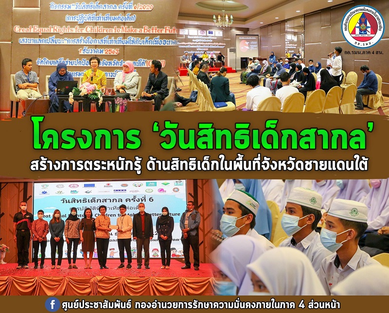 วันนี้ (1 ธันวาคม 2563) เวลา 10.30 น. ที่ ห้องประชุม โรงแรมปาร์คอินทาวน์ อำเภอเมือง จังหวัดปัตตานี เครือข่ายปกป้องเด็กจังหวัดชายแดนใต้ (Child protection network หรือ CPN) จัดโครงการ วันสิทธิเด็กสากล ครั้งที่ 6 “Create a equal right for Children to make a better future” (การปฏิบัติที่เท่าเทียมต่อเด็ก) เพื่อให้เด็กได้ตระหนัก เรียนรู้ ถึงสิทธิและเข้าถึงสิทธิของเด็กได้อย่างเท่าเทียม สร้างความตระหนักรู้ด้านสิทธิเด็กให้กับหน่วยงานรัฐ องค์กรพัฒนาเอกชน และผู้ที่เกี่ยวข้องในการปกป้อง และคุ้มครองเด็กในพื้นที่จังหวัดชายแดนใต้ ผ่านเวทีเสวนา ในหัวข้อ “การสร้างโอกาสที่เท่าเทียมให้กับเด็ก เพื่ออนาคต” โดยมี คุณกนกรัตน์ เกื้อกิจ ผู้ช่วยเลขาธิการศูนย์อำนวยการบริหารจังหวัดชายแดนภาคใต้เป็นประธานในพิธีเปิด พร้อมด้วย ผู้แทนองค์กรพัฒนาเอกชน, ผู้ที่เกี่ยวข้องในการปกป้องและคุ้มครองเด็กในพื้นที่จังหวัดชายคนใต้ และเยาวชนในพื้นที่เข้าร่วมกิจกรรม