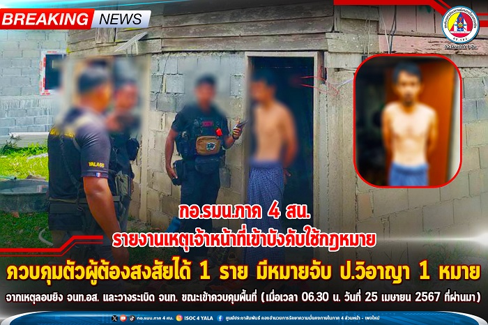ล่าสุด วันนี้ 25 เมษายน 2567 เวลา 10.00 น. หน่วยปฏิบัติการพิเศษร่วมประจำจังหวัดยะลา ร่วมกับส่วนที่เกี่ยวข้อง จัดกำลังเข้าตรวจสอบพื้นที่เกิดเหตุ และระหว่างทำเส้นทางให้ปลอดภัยได้ดำเนินการลาดตระเวนตรวจสอบพื้นที่บริเวณใกล้เคียง พบบุคคลต้องสงสัย จำนวน 1 นาย ทราบชื่อ นายมะรูดิง ดอเลาะ อายุ 43 ปี ที่อยู่ 19 หมู่ที่ 4 ตำบลตาเนาะปูเต๊ะ อำเภอบันนังสตา จังหวัดยะลา ซึ่งมีหมายจับ ป.วิอาญา จำนวน 1 หมาย ที่ 410/2560 ลงวันที่ 12 กันยายน 2561 จากเหตุคนร้ายโจมตีจุดตรวจร่วม 3 ฝ่าย สถานีตำรวจภูธรกรงปินัง จังหวัดยะลา เมื่อวันที่ 3 เมษายน 2560 เจ้าหน้าที่จึงได้เชิญตัวไปยังศูนย์ซักถาม หน่วยเฉพาะกิจกรมทหารพรานที่ 41 เพื่อดำเนินกรรมวิธีซักถามและขยายผลต่อไป ทั้งนี้ในขั้นตอนการปฏิบัติ กองอำนวยการรักษาความมั่นคงภายในภาค 4 ส่วนหน้า ได้กำชับให้เจ้าหน้าที่พูดคุยและสร้างความเข้าใจแก่ครอบครัวและญาติของผู้สงสัย ให้ทราบถึงขั้นตอนการทำงานของเจ้าหน้าที่ รวมทั้งให้ปฏิบัติด้วยความโปร่งใส ยุติธรรม คำนึงถึงหลักสิทธิมนุษยชนให้มากที่สุด