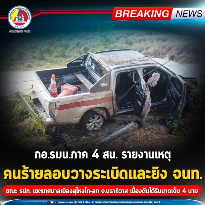 วันนี้ 29 เมษายน 2567 เวลา 00.05 น. เกิดเหตุคนร้ายลอบวางระเบิด เจ้าหน้าที่หน่วยปฏิบัติการพิเศษนราธิวาส 33 ในพื้นที่บ้านกวาลอซีรา หมู่ที่ 7 ตำบลปาเสมัส อำเภอสุไหงโก-ลก จังหวัดนราธิวาส ขณะเจ้าหน้าที่หมวดเฉพาะกิจหน่วยปฏิบัติการพิเศษนราธิวาส 33 จัดกำลังพล จำนวน 4 นาย เดินทางด้วยรถยนต์หุ้มเกราะ จำนวน 1 คัน เพื่อไปปฏิบัติหน้าที่รักษาความปลอดภัยในเขตเทศบาลเมืองสุไหงโก-ลก ขณะเดินทางออกจากฐานปฏิบัติการ เมื่อมาถึงบริเวณสามแยกปากทางออกจากฐานปฏิบัติการได้เกิดเหตุระเบิดขึ้นและคนร้ายใช้อาวุธปืนยิงเข้าใส่เจ้าหน้าที่ เจ้าหน้าที่จึงได้ทำการยิงตอบโต้ เบื้องต้นมีผู้ได้รับบาดเจ็บ จำนวน 4 นาย นำตัวส่งเข้ารับการรักษายังโรงพยาบาลสุไหงโก-ลก อำเภอสุไหงโก-ลก จังหวัดนราธิวาส ทราบชื่อ ดังนี้