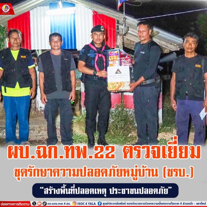 เมื่อวันที่ 28 เมษายน 2567 พันเอก อุเทน จีนทองหลาง ผู้บังคับหน่วยเฉพาะกิจกรมทหารพรานที่ 22 ลงพื้นที่เยี่ยมการปฏิบัติงานของชุดรักษาความปลอดภัยหมู่บ้าน (ชรบ.) ของชุมชนไทยพุทธ (บ้านลานควาย) ตำบลกอลำ อำเภอยะรัง จังหวัดปัตตานี ตามแผนการบูรณาการควบคุมพื้นที่ ขณะแสดงกำลัง ตั้งจุดตรวจ/จุดสกัด (pop-up) พร้อมทั้งให้คำแนะนำในการปฏิบัติงาน ตลอดจนมาตรการเฝ้าระวังป้องกันตนเอง และแจ้งเตือนข่าวสารตามภาพข่าวที่เกิดขึ้น โอกาสนี้ ผู้บังคับหน่วยเฉพาะกิจกรมทหารพรานที่ 22 ได้มอบสิ่งของบำรุงขวัญ และสนับสนุนงบประมาณให้กับชุดรักษาความปลอดภัยหมู่บ้าน (ชรบ. ) เพื่อสร้างขวัญและกำลังใจในการปฏิบัติงานในพื้นที่ชุมชน ต่อไป