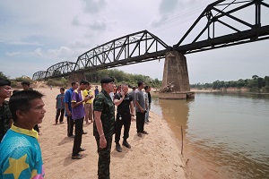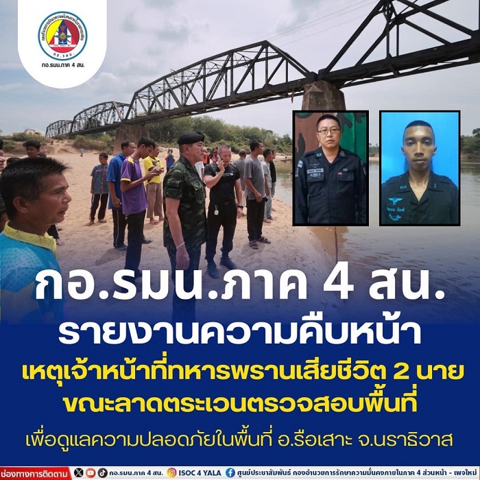 จนกระทั่งวันนี้ 30 เมษายน 2567 เวลา 09.00 น. ร้อยเอก จุลพงษ์ ทัพมีชัย ตำแหน่ง ผู้บังคับกองร้อยทหารพรานที่ 4608 หน่วยเฉพาะกิจกรมทหารพรานที่ 46 ได้จัดกำลังพล 1 ชุดปฏิบัติการ จำนวน 9 นาย ทำการออกลาดตระเวนตรวจสอบพื้นที่บริเวณริมแม่น้ำสายบุรี ควบคู่การรักษาความปลอดภัยเส้นทางรถไฟ เพื่อดูแลความปลอดภัยในชีวิตและทรัพย์สินของพี่น้องประชาชน รวมถึงป้องกันการกระทำผิดกฎหมายต่างๆ ในระหว่างขณะปฏิบัติภารกิจการลาดตระเวน ตรวจพบบุคคลต้องสงสัย จำนวน 2 คน วิ่งหลบหนี จึงได้ไล่ติดตามจนมาถึงบริเวณพื้นที่เกิดเหตุริมแม่น้ำซึ่งเป็นตลิ่งที่ถูกกัดเซาะ และมีความลาดชันสภาพดินไม่แข็งแรงทำให้ตลิ่งพังจนเป็นเหตุให้กำลังพลพลัดตกลงไปในน้ำและจมน้ำหายไป จำนวน 2 นาย