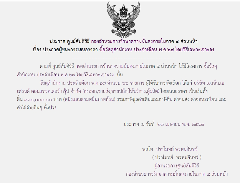 จัดซื้อ จัดจ้างประกาศผู้ชนะการเสนอราคา ประกาศผู้ชนะการเสนอราคา ซื้อวัสดุสำนักงาน ประจำเดือน พ.ค.๖๗ โดยวิธีเฉพาะเจาะจง May 1, 2024 292 Share Facebook Twitter Google+ Telegram LINE