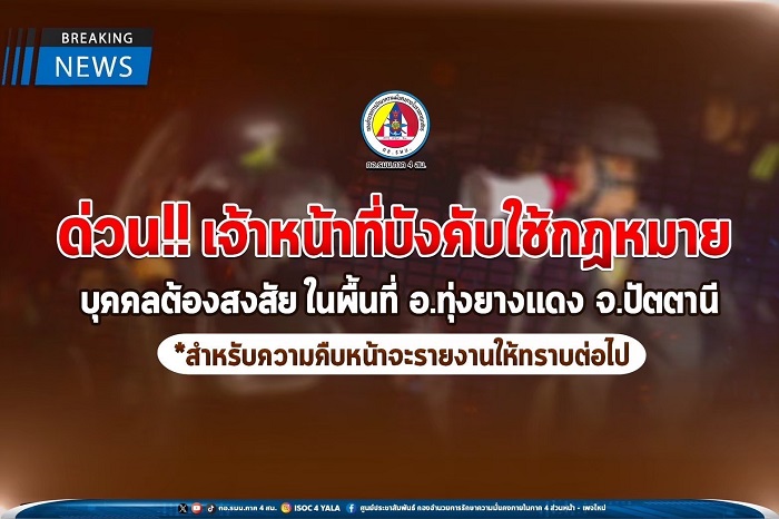 เมื่อวันที่ 1 พฤษภาคม 2567 เวลา 16.00 น. หน่วยปฏิบัติการพิเศษร่วมประจำจังหวัดปัตตานี ได้สนธิกำลัง 3 ฝ่าย เข้าบังคับใช้กฎหมายเพื่อตรวจสอบบุคคลต้องสงสัย ในพื้นที่อำเภอทุ่งยางแดง จังหวัดปัตตานี ปัจจุบันเจ้าหน้าที่อยู่ระหว่างดำเนินการ สำหรับความคืบหน้าจะรายงานให้ทราบต่อไป